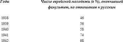 Несмотря на чистки конца 30-х годов, удельный вес лиц еврейской национальности в госаппарате, а также в учреждениях культуры, науки, искусства и других привилегированных сфер деятельности был непомерно высок. Как я уже отмечал, во многих учреждениях этих сфер доля евреев составляла 40-60% всех работников.
