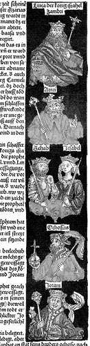 Рис. 3.46. Израильские цари: Замрий (Замврий), Амрий (Амврий), Ахав с Иезабелью, Ахазия, Иорам. Из «Всемирной Хроники» Шеделя. Перед нами — средневековые правители. Некоторые держат в руках скипетр с христианским крестом и державу. Следовательно, их считали христианскими царями. Взято из [1396:1], лист XLIX, оборот.