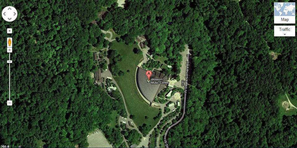 Несколько лет назад судьба подарила меня возможностью побывать на музыкальном фестивале. Называется он Blossom Festival. Это ежегодно проводимый фестиваль классической музыки. Проводится он в штате Огайо и проводится не в концертном зале, а "на природе" в специально выстроенном для этого Blossom Music Center. Расположен Blossom Music Center на границе национального парка и находится он примерно в пятидесяти километрах к югу от Кливленда. С высоты птичьего полёта выглядит он вот так: