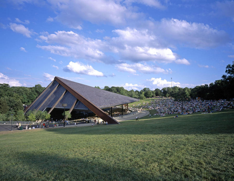 Снаружи, на лужайке могут разместиться ещё более тринадцати тысяч, так что всего слушателей собирается около двадцати тысяч. Весь комплекс был задуман как летняя резиденция Кливлендского Симфонического Оркестра (The Cleveland Orchestra). Оркестр считается одним из лучших в мире (на мой любительский вкус он - лучший), оркестр старый, заслуженный, с "традициями", сменявшие друг друга дирижёры - все мировые величины, то же и с музыкантами, и вот после зимнего сезона, проведённого в собственном концертном зале Severance Hall, оркестр на протяжении шести летних недель даёт серию концертов в Blossom Music Center, построенном в конце шестидесятых прошлого уже столетия. Было найдено уникальное место с естественным акустическим эффектом, строил центр известный архитектор Питер ван Дийк, к строительству были привлечены специалисты по акустике и в результате получилось то, что можно назвать волшебством. С непривычки просто ошеломляет, сидишь и автоматически ждёшь того же звука, что и в зале, а стоит только оркестру начать, как хлынувшая музыка заливает всё вокруг, заполняя собой всю низину, в музыке в букальном смысле тонешь. Когда-нибудь, в лучшем будущем, музыку в мире, за исключением камерной, будут исполнять только так.