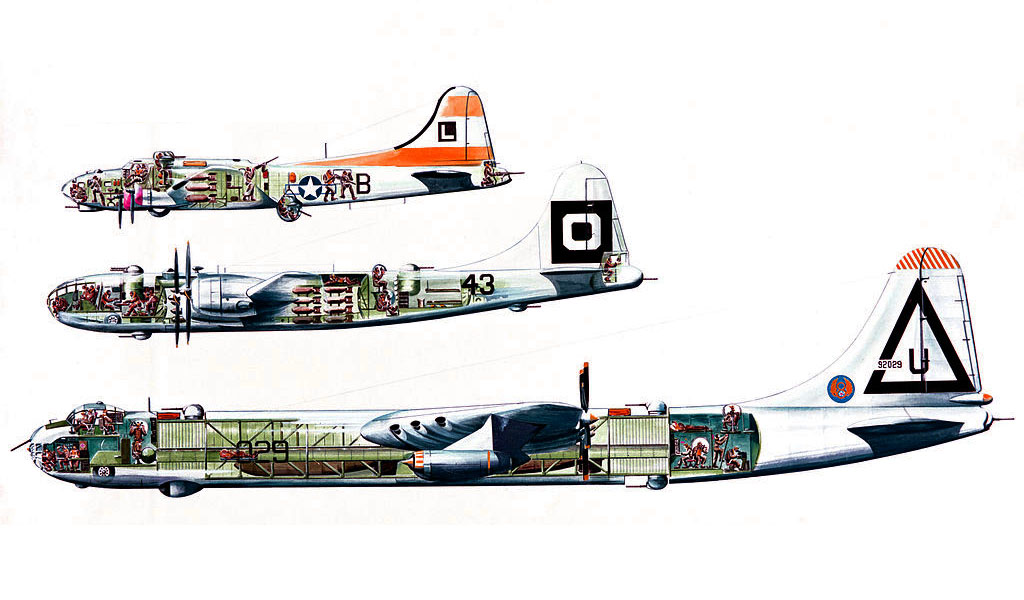 Mega Bomber В-36 (его ещё называли Monster Bomber, а острословы даже Be Good Stalin Bomber) вполне официально носил имя Peacemaker. "Миротворец". Почему бы и нет. В конце концов ещё древние знали, что если хочешь мира, готовься к войне, а нам известно даже то, что не было известно древним римлянам - хочешь войны, готовься к миру. Во всём мире. Именно для этого и нужны бомбардировщики. Чем больше, тем лучше. Большому самолёту большой полёт. На этом рисунке можно увидеть пропорции мега-бомбера в сравнении с тяжёлыми бомбардировщиками Второй Мировой B-17 и B-29: