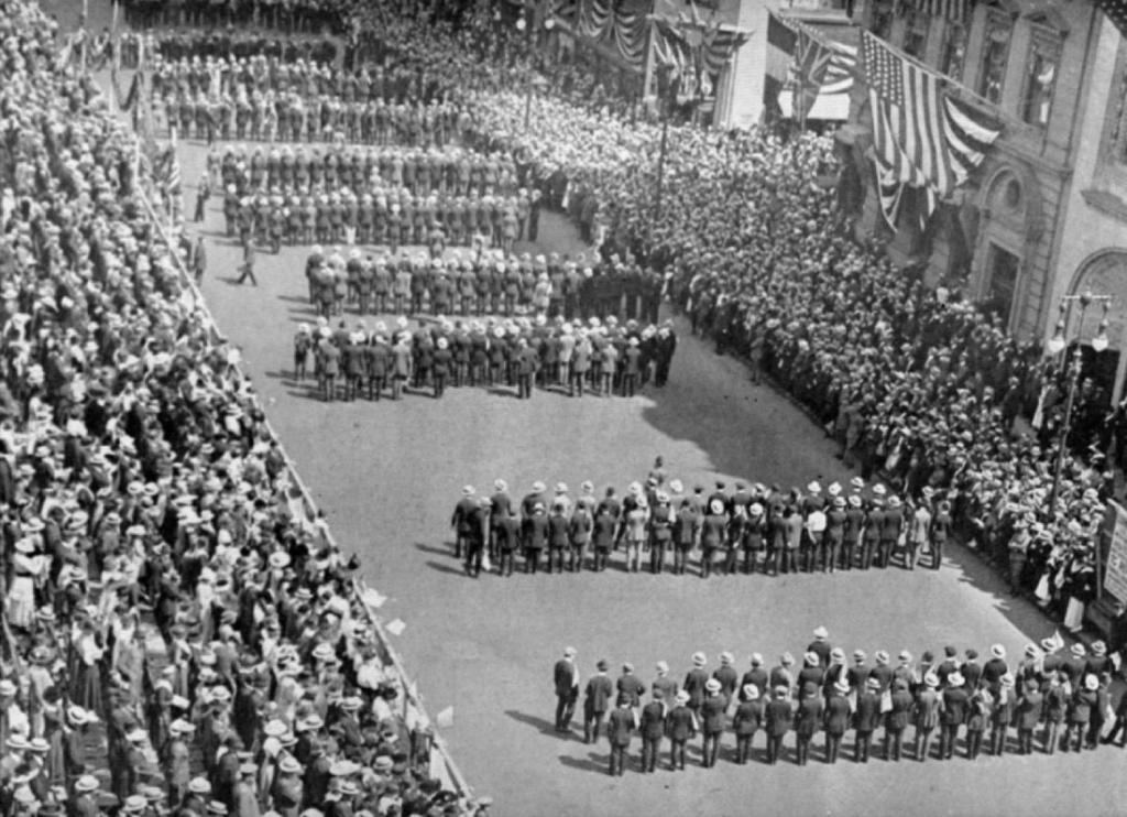 Почему такая, граничащая с религиозным экстазом, картинка? Ответ очень прост - Державы приоткрыли дверь войны и жестом пригласили Америку войти. И Америка образца 1917-го года собою, своим до самых до окраин нутром, невыговариваемым словами инстинктом поняла, что ей не какими-то там "державами", а Судьбой (или Историей, или Богом, назовите как хотите) даётся шанс. Шанс, который даётся государству один раз. Шанс, который упустить нельзя.