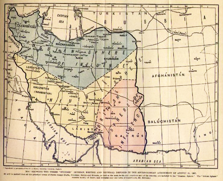 - и третье и самое главное - обе стороны не только признают незавиcимость Персии, но они эту самую независимость ещё и гарантируют, но при этом Персия делится на три зоны - на британскую сферу влияния, на российскую сферу влияния и на нейтральную центральную зону. Независимость, гарантии и три зоны. Ещё раз - независимость, гарантии и при независимости и гарантиях - три зоны. Как это может быть? Да вот так как-то… Белый человек - сложный человек. И сознание у него такое же.