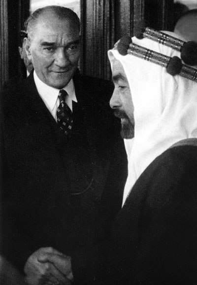 Два человека, добившихся цели. Два националиста, которым удалось стать "первыми лицами". Была Империя, а теперь обмениваются рукопожатием главы Турции и Трансиордании. Руку президенту жмёт эмир.