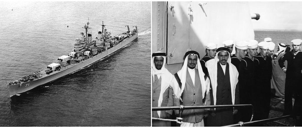 Началось всё, правда, с небольшого конфуза - ибн Сауда должен был подобрать в Джидде американский эсминец "Мэрфи" и доставить в целости и сохранности к стоявшему в Суэцком канале крейсеру "Квинси". В условленный час правительственная делегация Саудовского Королевства появилась в порту Джидды. Американцы увиденным были ошарашены - ибн Сауд прибыл со свитой в 200 человек, гаремом, верблюдами, скакунами и опахалами - восточный же король, самый настоящий, из тысячи и одной ночи. После разъяснений что такое военный корабль ибн Сауда удалось убедить оставить на берегу женщин и часть свиты и на эсминец поднялась делегация в составе 48-ми человек, среди которых имелись придворные заварщики кофе, повара и шесть телохранителей-нубийцев с заткнутыми за пояс обнажёнными мечами. На борт также затащили нескольких баранов, которых предполагалось съесть по дороге. А дорога предстояла неблизкая - 800 морских миль, саудиты полагали, что ибн Сауд, который до того таких путешествий не предпринимал, оказывает дорожными тяготами особую честь американцам. Между прочим, ибн Сауд наотрез отказался ночевать в каюте и для него на деке был раскинут шатёр, где он и проводил время. Что же до чести, то и американцы подошли к делу со всем возможным уважением - капитан, когда подходило время молитвы, разорачивал эсминец в сторону Мекки и стопорил машину, давая королю возможность совершить намаз.