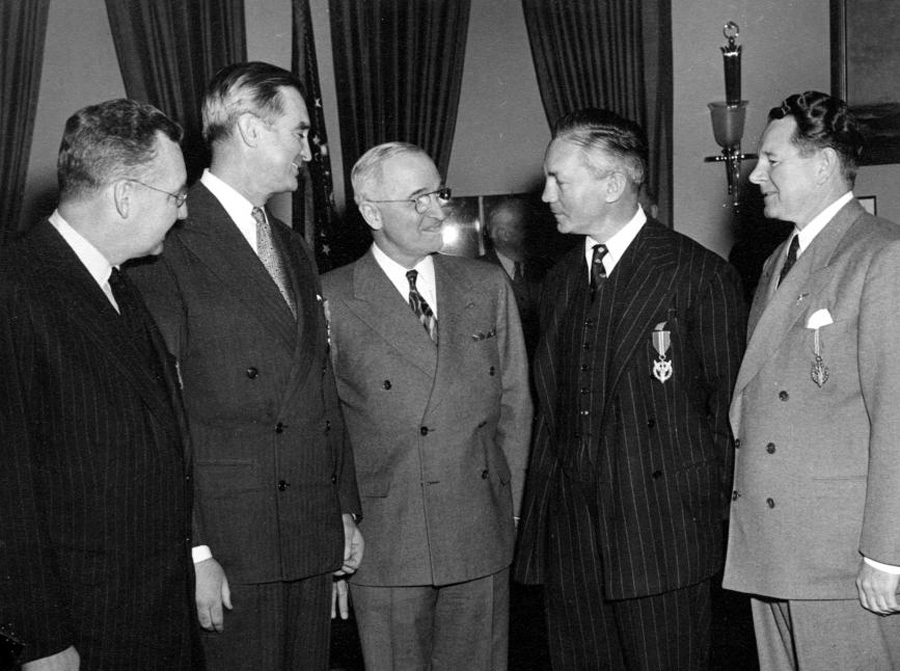 Фото сделано в Белом Доме 27 января 1948 года после церемонии награждения секретаря обороны и секретарей по делам армии, ВМС и ВВС медалью "За Заслуги" (Medal of Merit), одной из высших государственных наград для гражданских служащих. Второй справа - Форрестол, второй слева - Саймингтон.