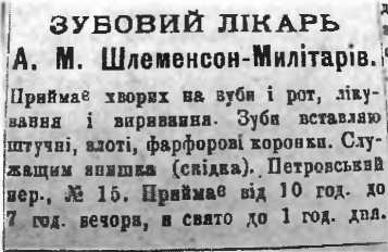 Изредка стала появляться и реклама на украинском языке (правда, это было абсолютным исключением). Чуть ли не первую рекламу в Харькове издал стоматолог А. Шлеменсон — Милитарев. Правда, язык, на котором публиковалась реклама, украинским можно назвать с большой натяжкой: «Зубовий лікарь А. М. Шлеменсон — Милітарів. Приймає хворих на зуби і рот, лікування і виривання. Зуби вставляю штучні, злоті, фарфорові коронки. Служащим знишка (скідка)»[1091]. Как видим, некоторые слова в рекламе приходилось пояснять — ну откуда харьковцы могли до этого знать, что такое «знишка»? Да и сами украиноязычные газеты, выходившие в Харькове, вынуждены были часть украинских слов пояснять в скобках. К примеру, слово «квітень» в шапке газет обязательно сопровождали пояснением — «апрель». Иначе могла бы возникнуть путаница.