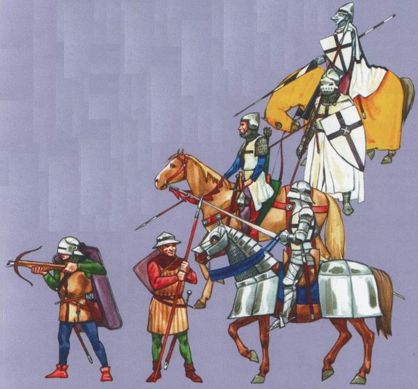 Воины Тевтонского ордена XV века: конный и пеший рыцари, сержант, тяжеловооруженный рыцарь в готических доспехах, кнехт, арбалетчик. Реконструкция В. Ляхора