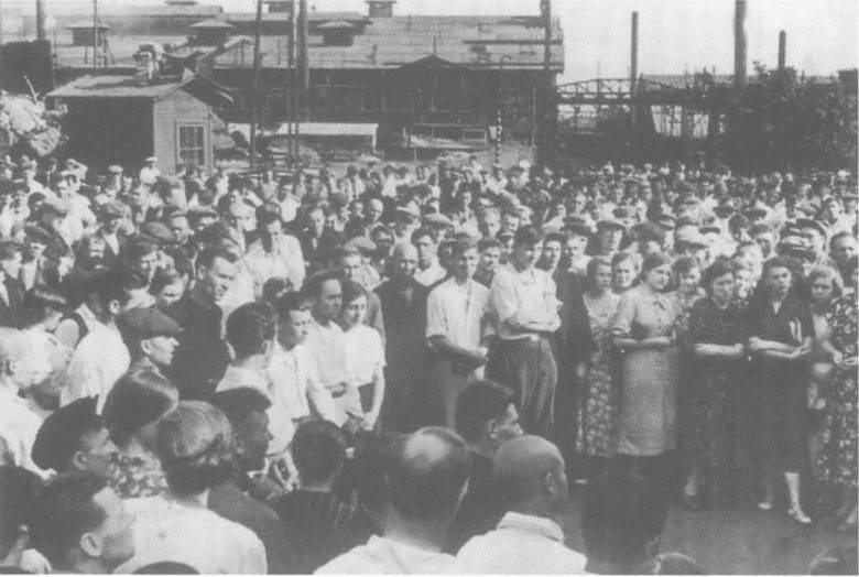 Фото 13. Рабочие завода «Красный пролетарий» слушают речь парторга. 1939 г. Напечатано с разрешения РГАКФД