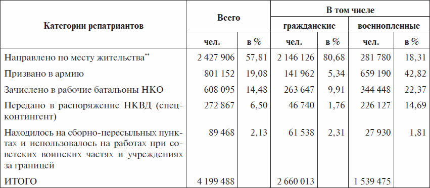 ** Включая репатриантов – немцев (советских граждан), крымских татар, чеченцев, ингушей, карачаевцев, балкарцев и некоторых других, направленных на спецпоселение. Репатриированных из Финляндии ингерманландцев, вопреки обещаниям отправить их на родину в Ленинградскую область, насильственно расселили в Великолукской, Калининской, Ярославской, Псковской и Новгородской областях. Репатрианты, умершие в период нахождения их в лагерях, сборно-пересыльных, проверочно-фильтрационных и других сборных и проверочных пунктах, включены в число направленных к месту жительства.