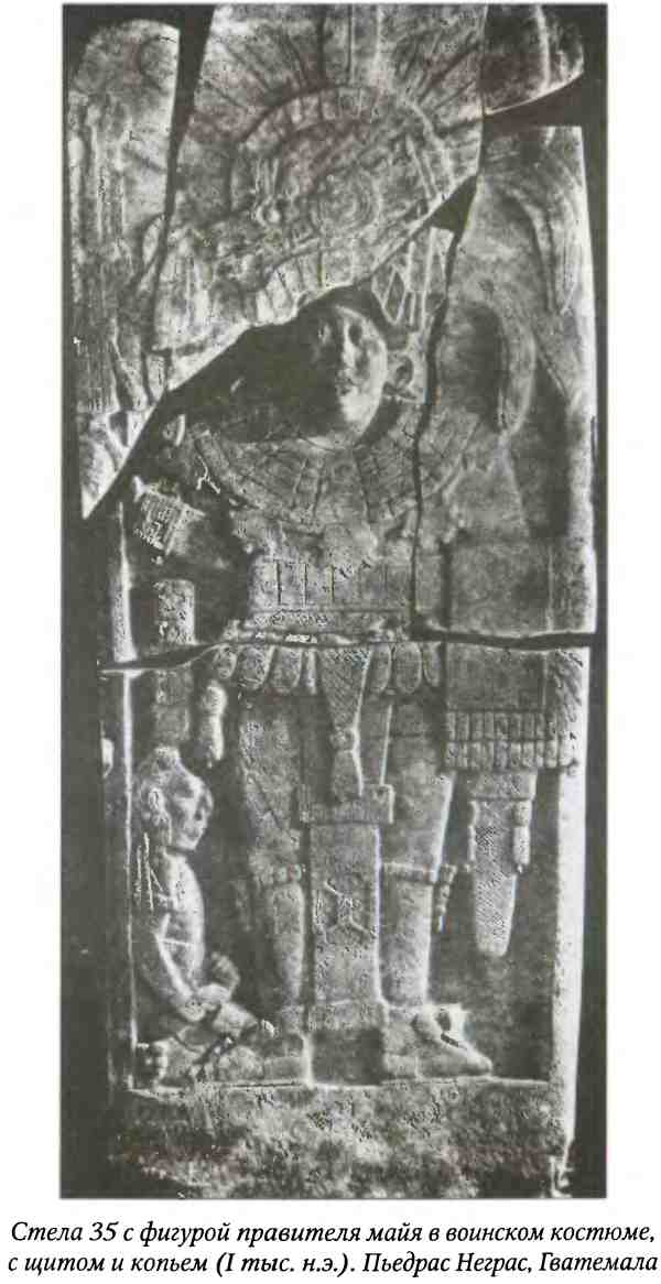 В другой группе каменных скульптур (стелах из Тикаля, Пьедрас-Неграс и других древних городищ) запечатлены сцены ритуального сева, совершаемого, по-видимому, лично правителем города-государства. Так, на одной из стел в Пьедрас-Неграс правитель, облаченный в головной убор из листьев маиса, стоя на коленях на платформе или троне, бросает горсть зерен, взятых, видимо, из длинной узкой сумки, которую он держит в левой руке. Внизу изображено божество земли. Вся сцена обрамлена с боков длинными стеблями маиса. Общий аграрно-культовый характер этого изображения не вызывает сомнений. Довольно значительную группу в искусстве древних майя составляют изображения божеств — покровителей земледелия (боги маиса, какао и др.).