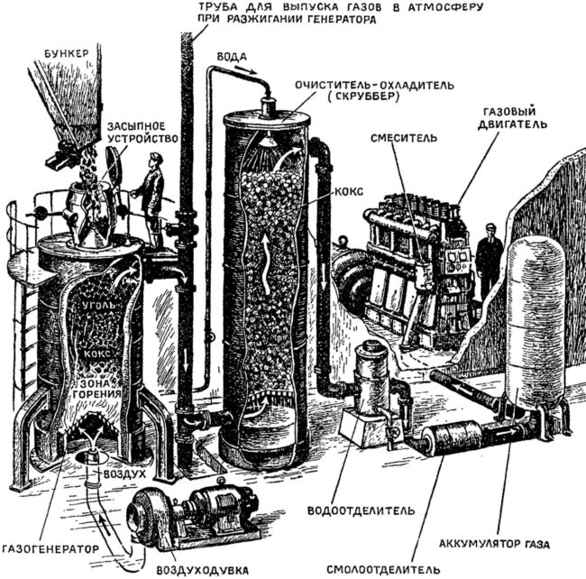 Что такое газогенератор? Это устройство, вырабатывающее газ. Вы помните, как в колбе Лебона появился горючий газ? Деревянные опилки сжигали при малом доступе воздуха. На этом, собственно, принципе работают и современные газогенераторы. Стоит особая печь, в нее заваливают дрова, торф или уголь, там топливо тлеет, а горючие газы засасываются двигателем прямо из этой печи — газогенератора. По пути в двигатель газы проходят фильтры, холодильники, — в цилиндры они попадают чистые и несколько охлажденные.