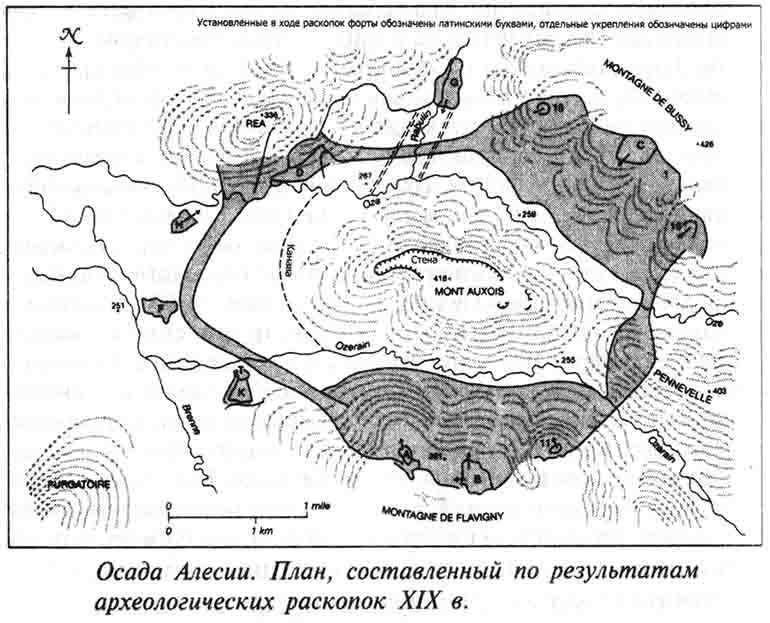 Место древнего города было обнаружено и раскопано по распоряжению Наполеона III, питавшего особую страсть к этому эпизоду истории Франции[75]. Новые археологические работы с применением современных методов дают картину, которая во всех важных отношениях разительно сходится с описанием, приведенным в «Записках о Галльской войне». Размеры рвов не всегда точно совпадают с указаниями Цезаря, но это не удивительно из-за размаха инженерных работ.