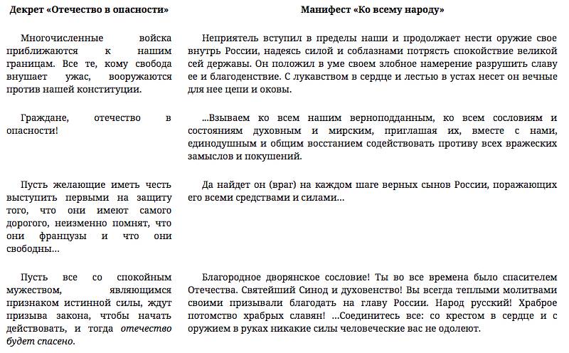 6 июля был объявлен «Манифест ко всему народу о всеобщем вооружении» — совершенно беспрецедентный в истории Российской империи призыв к нации, структурно параллельный и воспроизводящий основные положения французского революционного декрета 11 июля 1792 г. «Отечество в опасности». Никакого «всего народа» не существовало в России ни в виде гражданской, ни в виде этнокультурной, ни в виде политической (сплоченной ценностями) нации — однако же Александр I полагал, что именно таким должен быть ответ на вторжение наполеоновской Франции: