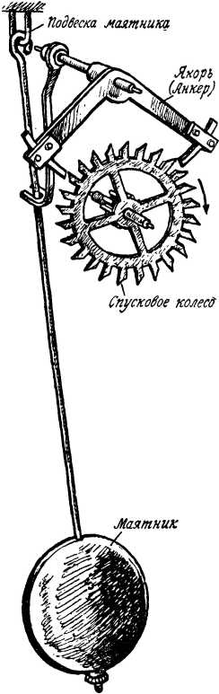 Устройство механизма часов с маятником понятно из чертежа. К верхней части маятника прикреплена пластинка с двумя зубцами-лапками различной формы. Пластинка похожа на двухлопастный морской якорь; она и называется якорем.
