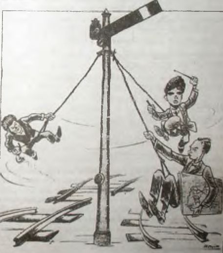 «Семенко, Шкурупий и Бажан семафорят в будущее» Карикатура на украинских футуристов из журнала «Глобус» за апрель 1927 года