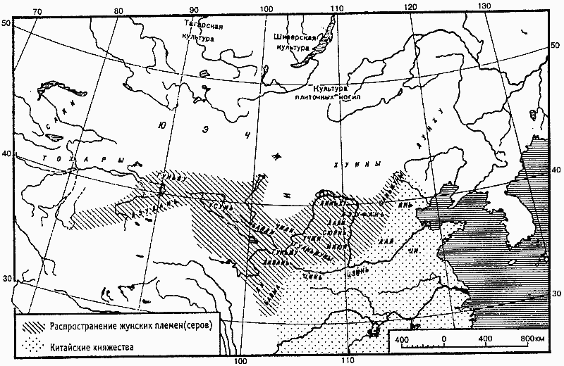 Во II тысячелетии до н.э. в Южной Сибири археологи различают две синхронные самостоятельные культуры: глазковскую на востоке и андроновскую на западе. «На территории Прибайкалья обитала группа родственных друг другу племен, которые могли быть скорее всего предками современных эвенков, эвенов или юкагиров. Культура их... была чрезвычайно близка к культуре обитателей верховьев Амура и Северной Маньчжурии, а также Монголии, вплоть до Великой китайской стены и Ордоса. Не исключено, следовательно, что вся эта обширная область была заселена родственными друг другу по культуре племенами охотников и рыболовов неолита и ранней бронзы... вероятно, говорившими на родственных друг другу племенных языках»[69]. Позднее с южной частью этих племен – носителей глазковской культуры – столкнулись и перемешались некоторые предки хуннов[70]. Западную половину Южной Сибири и Казахстан до Урала занимала с 1700 по 1200 г. до н.э. андроновская культура. Носители ее, принадлежавшие к белой расе, в XVIII веке до н.э. овладели Минусинской котловиной и чуть-чуть не сомкнулись с глазковцами на Енисее[71]. Андроновцы были земледельцами и оседлыми скотоводами[72]; из металлов они знали бронзу, в их могилах сохранились многочисленные изящно орнаментированные глиняные сосуды. Андроновская культура связана с западом. «Неоднократно отмечалось большое сходство андроновских памятников со срубными нижневолжских, донских и донецких степей»[73]. Но не андроновцы и не глазковцы играли первую роль в Южной Сибири во II тысячелетии до н.э.