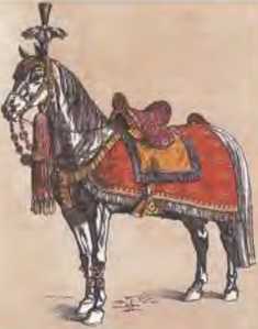 Царский конь в парадном убранстве. Старинная акварель.