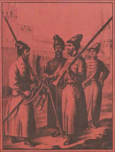 Стрельцы московских стрелецких полков, XVI в. Старинная литография.