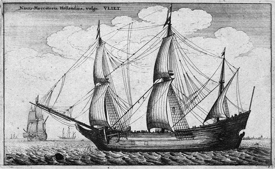 Швидкий і маневровий корабель флейт зробив голландців у XVII ст. королями світового ринку. Флейт був спроектований задля перевезення максимально великої кількості вантажу. Залежно від тоннажу зазвичай потрібно було лише двадцять, ба навіть менше членів екіпажу, що на одну п’яту частину менше, ніж на суднах конкурентів. Англійці почали наслідувати дизайн цих суден наприкінці XVII ст., коли отримали голландські кораблі як військові трофеї. Малюнок Вацлава Холлара, XVII ст.