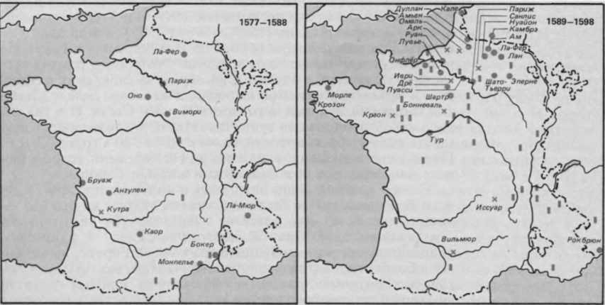 Религиозным войнам не удалось одним махом охватить обширное французское королевство даже после восшествия на престол Генриха IV. В качеств военных событий на картах сохранены лишь важные сражения (по данным написанного Анри Марьежолем тома «Истории Франции» Лависса). Из этого вытекает очевидное упрощение. Однако ясно, что не все эти события совпадали, что пространство противилось «заразе». Даже заключительная фаза войн, во времена Генриха IV, развертывалась прежде всего на севере страны.