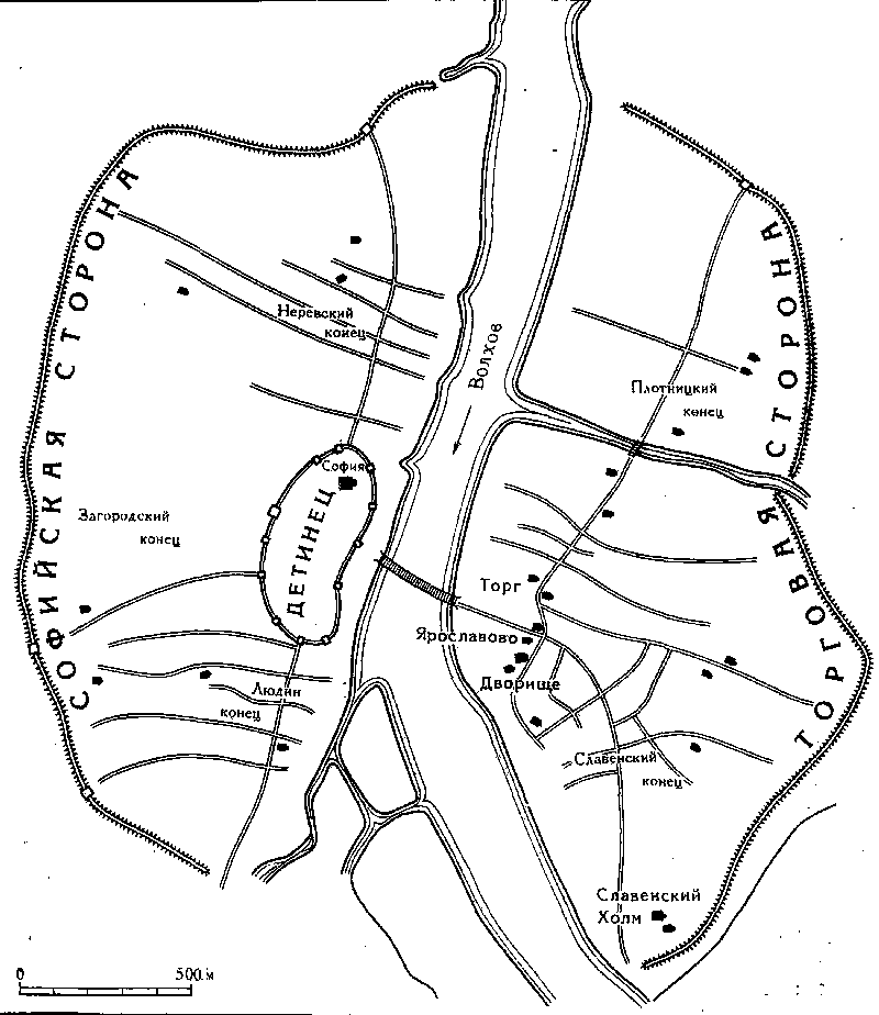 Та ранняя пора, когда городок на Волхове был далекой факторией Киева, отразилась частично в феодальном делении Новгородской земли. Обычно каждое русское княжество составляло «тьму», т. е. десять «тысяч», десять военно-финансовых округов; каждая тысяча делилась на «сотни». Новгородская же земля составляла всего лишь одну тысячу, делившуюся на сотни, расположенные веером вокруг Новгорода радиусом в 200–300 км. Значит, Киев не признавал Новгород равноправным другим частям Руси (например, Волыни или Смоленщине) и рассматривал его лишь как одну десятую часть какого-то целого (может быть, самой «Киевской тьмы»?). Правда, город тоже составлял десять сотен, т. е. еще одну тысячу, но все же до полного десятитысячного комплекта было далеко.