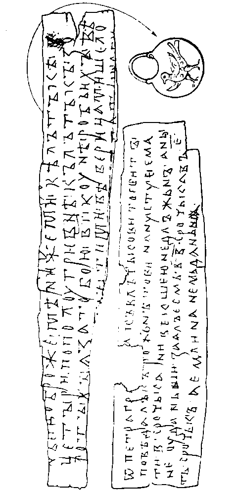 Берестяные грамоты XII в. (№ 335 и 336). Наверху — письмо о золотых «колтах»; внизу — перечень повинностей