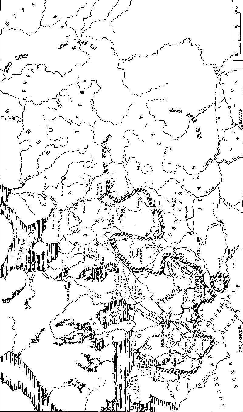 Вот именно здесь, на пограничье двух ландшафтных областей, где на протяжении сотен километров пришли в соприкосновение славянские и угро-финские племена, предки эстонцев, карелов, вепсов, коми, удмуртов, и возникла цепь древних городков, окаймлявших самые северные земли, до которых добрались в эпоху родо-племенного строя славяне. Таковы Псков и Изборск близ Чудского озера, Новгород на Ильмене, Белоозеро, Ростов. Одни из них возникли еще в догосударственную пору и были центрами тех или иных племенных союзов, другие же были поставлены как «новые города», как северные фактории Киевской Руси. Вероятно, к их числу и относился Новгород, возникший в IX в. Сложение государственности на юге изменило судьбу этих порубежных городов. Русские дружинники перешагнули в IX–X вв. границу двух ландшафтных зон, удерживавшую пахарей, и углубились в тайгу, открывая неведомые земли, встречаясь с различными народами и привозя в Киев вещи, изготовленные кузнецами Урала.