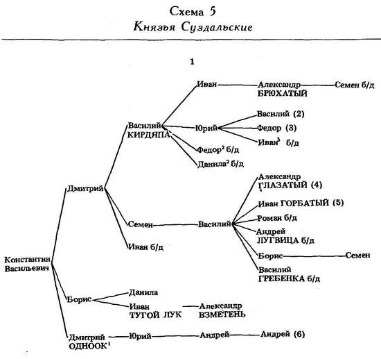 Суздальско-Нижегородское княжество было ликвидировано как самостоятельное в конце XIV в. По завещанию 1423 г. Василий I передавал Нижний своему старшему сыну Василию.[337] Суздаль, правда, там не упоминался. Возможно, в нем сидели полузависимые от Москвы князья (схема 5).