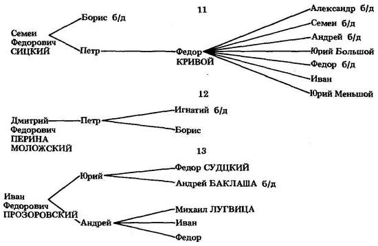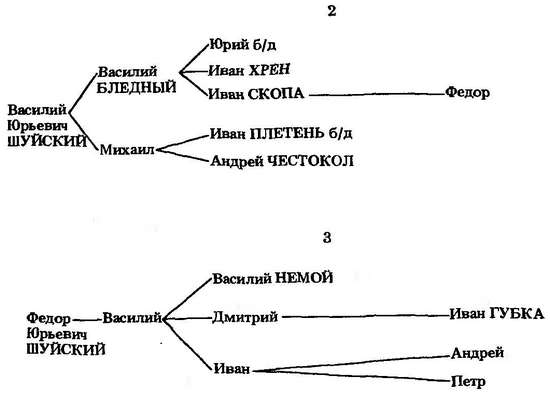 Старшую ветвь суздальских князей представлял в 70-х годах XV в. кн. Федор Юрьевич Шуйский. В 1470—1471 гг. он наместничал со своим сыном Василием во Пскове.[342] Там же в октябре 1477 г. и в 1480—1481 гг. находился и Василий Васильевич Бледный, племянник Федора Юрьевича. В 1492 г. он ходил первым воеводой правой руки на Северу.[343] Брат Василия Бледного Михаил в 1495 г. ездил в свите Ивана III в Новгород. В мае 1508—мае 1514 г. (в 1508/09 г. ?) он вместе с В. М. Заболоцким был переславским наместником и «стерег» в Переславле детей «княж Ондреевых» (Углицкого).[344] Сын Василия Бледного Иван Скопа был родоначальником Скопиных-Шуйских. Он упоминался в разрядах под 1492 г.[345] Федор Иванович Скопин в малолетство Грозного стал боярином.[346]