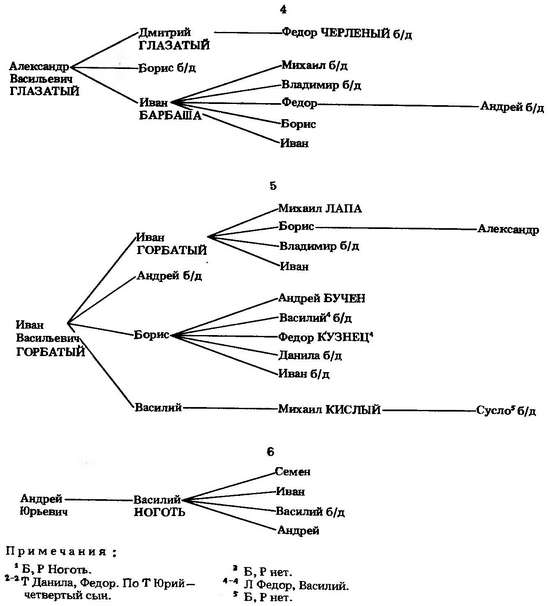 Вторая ветвь суздальских князей шла от внука Дмитрия Константиновича Василия Семеновича, у которого было шестеро сыновей: Александр Глазатый, Иван Горбатый, бездетные Роман и Андрей Лугвица, служивший князю Ивану Андреевичу Можайскому, Борис и бездетный Василий Гребенка. Об И. В. Горбатом нам уже приходилось говорить выше. Возможно, около 1472—1479 гг. он был суздальским наместником.[364] Борис еще в 1436 г. княжил во Пскове.[365]
