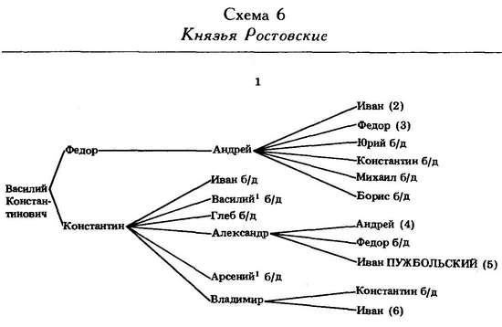 Более примечательна ветвь ростовских князей, шедшая от Константина Васильевича, женатого на дочери Ивана Калиты. Из его шести сыновей (Иван, Василий, Глеб, Александр, Арсений, Владимир) четверо умерли бездетными. У Александра было трое сыновей: Андрей, бездетный Федор и Иван Пужбольский.