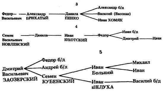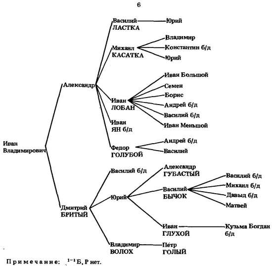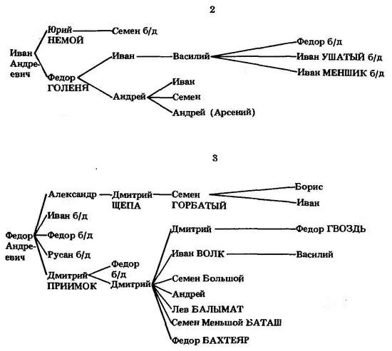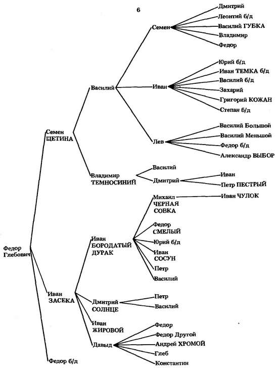 Третий сын Василия Грозные очи Роман известен как основатель г. Романова.[516] Его старший внук от первого сына (Ивана Неблагословенного свистуна) Федор Иванович Мортка (от него пошли Морткины) служил в Твери,[517] а младший Афанасий стал родоначальником князей Шехонских. Дети внука Романа Льва Даниловича Зубатого — Дмитрий Векошка и Василий — служили Василию Шемячичу.[518]