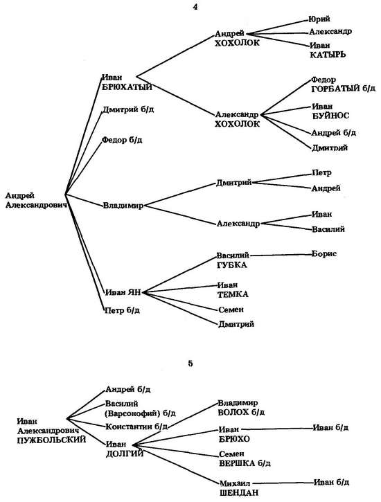 Дядя Владимира Андреевича Ростовского Иван Александрович был родоначальником князей Пужбольских.[423] Из четырех его сыновей дети были только у младшего — Ивана Долгого. Его мы застаем около 1471—1476 гг. на Двине. Здесь же владели землями двоюродные братья Долгого: бездетный Константин и Иван Владимировичи, а также их двоюродный племянник Федор Андреевич.[424] Внук Ивана Владимировича Иван Александрович Лобан около 1495 г. владел поместьем в Новгороде.[425] Там же было поместье и внука Дмитрия Бритого Ивановича Петра Владимировича.[426]