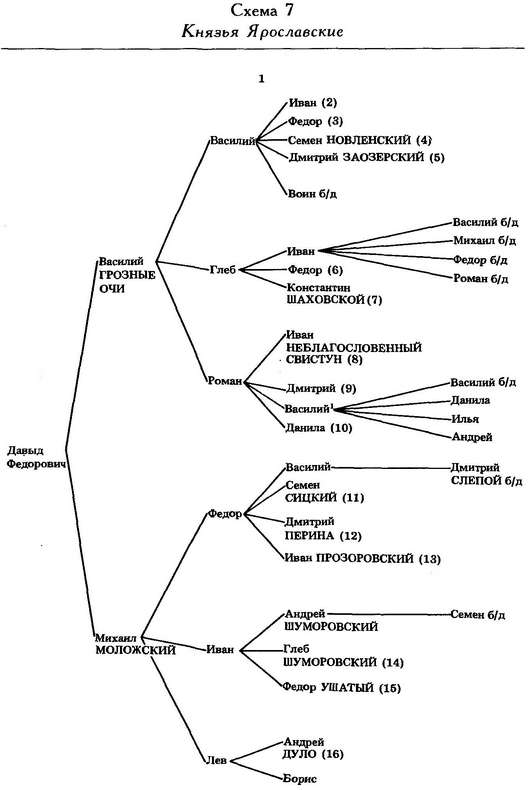 У Давыда Федоровича Ярославского (умер в 1321 г.) было два сына — Василий Грозные очи (умерший в 1345 г.) и Михаил.[428] При них Ярославское княжество стало дробиться. Первый из сыновей князя Давыда получил в наследие Ярославль, а второй — Мологу. У Василия было трое сыновей — Василий, Глеб и Роман.[429]