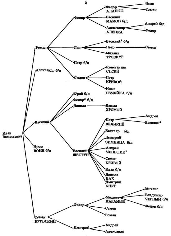 Внук Василия Грозные очи, Иван Васильевич, рано умер (1426 г.). Ярославль унаследовал его брат Федор, который «после отца на большом княжении был на Ярославле».[430] Какие-то земли в Ярославщине перепали сыновьям Ивана, а было их у него пятеро: Роман, бездетный Александр, Василий, бездетный Яков Воин и Семен Курбский. В удел Воину, как сообщают родословные книги, досталась Курба.[431] Но так как, скорее всего, Воин рано умер и к тому же бездетным, Курба перешла к Семену (откуда и его прозвище). Сохранение остатков суверенных прав на старинные земли не позволило детям Ивана Васильевича занять сколько-нибудь видное место при великокняжеском дворе.