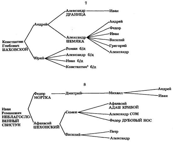 Не сложилась придворная карьера у Шаховских, связавших свою судьбу с Вологодским уделом и Новгородом. У Константина Шаховского было двое сыновей — Андрей и Юрий. Юрий еще около 1460—70-х годов сохранял остатки суверенных прав на какие-то земли в Ярославском крае.[512] Об Андрее нам известно только как об отце двух сыновей — Александра Драницы и Александра Шемяки. Последний из них служил Андрею Вологодскому.[513] Все его шесть сыновей были испомещены еще до 1495 г. в Деревской пятине Новгорода,[514] т. е. фактически были исключены из дворовых детей боярских, которым главным образом и перепадали доходные кормления и чины. Иван Юрьевич Шаховской промелькнул в разрядах летом 1482 г.[515]