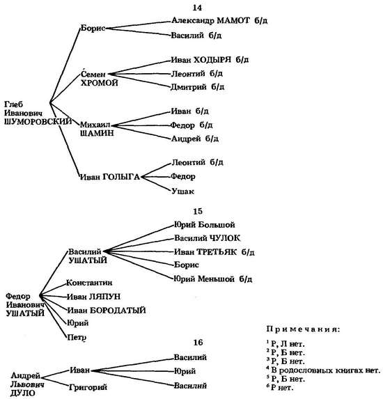 Иван Ляпун и Иван Бородатый Федоровичи Ушатые в 1495 г. сопровождали Елену Ивановну в Литву.[527] Весной того же года Иван и Петр Ушатые были посланы «на Каянскую землю». Князь Петр Ушатый упоминается также в походе кн. С. Ф. Курбского на Югру 1499/1500 г.[528] Иван Ляпун в 1501/02 г. наместничал в Торжке.[529] Из двух Иванов Ушатых Бородатый упоминается в разрядах 1502—1522 гг. Думных чинов он не получил.[530] Юрий Федорович Ушатый в источниках не встречается, а его сын Василий в 1524 г. был первым воеводой левой руки в судовой рати, отправленной в Казань.[531] Другой его сын, Юрий Меньшой, упоминается в грамоте 1521 г.[532]