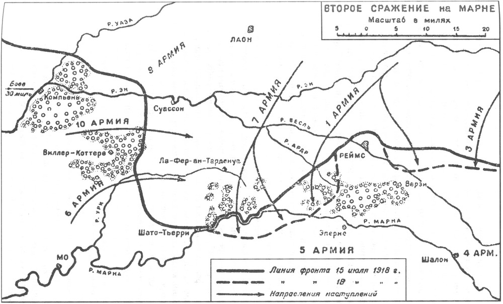 Это историческое совпадение изумительно и в то же время странно, именно Марна стала высшей точкой прилива победоносного наступления германцев в 1914 году, а четыре года спустя ей суждено было оказаться последним рубежом их последнего наступления, после которого, как и в 1914 году, когда схлынули волны, начался решающий отлив.