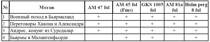 Восточноевропейская информация в этой саге распадается на четыре сюжетных мотива (см. табл. 17). Один из них связан с поездками норвежцев на Белое море (в Бьярмаланд). Наиболее интересен мотив переговоров русского князя Александра Невского с норвежским королем Хаконом Хаконарсоном и не получившего завершения сватовства Василия, сына Александра, к Кристин, дочери конунга Хакона. В саге также упоминается брат Александра Невского, Андрей Ярославин. Еще один мотив касается бегства бьярмов от нашествия татар в Норвегию.