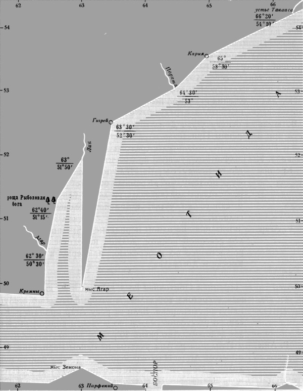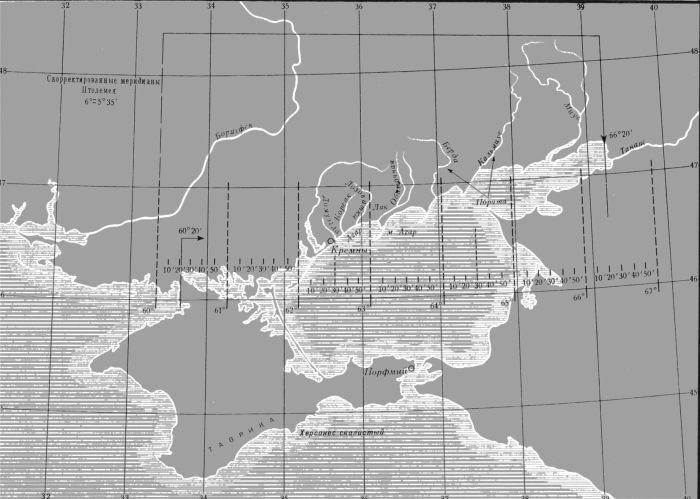 Пользоваться этой сеткой без учета специфики античной географии, разумеется, нельзя, т. к. Птолемей, например, представлял себе Меотиду вытянутой не в северо-восточном направлении, а в северном, и это сказалось на указываемых расстояниях. Все же для получения исходной позиции нам следует начать с попытки использования птолемеевых градусных расстояний.