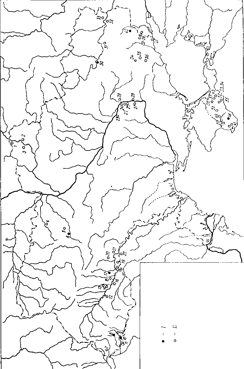 І — ашель; II — мустьє: 1 — Поболоття, Язви, Горохівський Ліг; 2 — Чулатів; 3 — Араповичі; 4 — Рихта; 5, 6 — Житомир; 7 — Замкова Гора, Горяне, Радванська Гора; 8, 9 — Рокосове; 10 — Королеве; 11 — Черна; 12 — Буківна; 13 — Касперівці; 14 — Більче Злоте; 15 — Кетроси; 16 — Стінка, Хотин; 17 — Сокіл, Лука-Врублевецька; 18 — Бабин І, ІІІ, VII; 19, 20 — Молодове I, V, Ожеве, Кормань IV; 21 — Соботівка; 22 — Наславча; 23 — Романкове; 24 — Кодак; 25, 26 — Військове, Скубова Балка; 27 — Круглик; 28 — Орел; 29 — Василівка І; 30 — Ізюм; 31 — Званівка, Мєлове; 32 — Червоний Яр; 33 — Деркул; 34 — Антонівка I, II; 35 — Олександрівка; 36 — Донецьк; 37—39 — Новоклинівка, Білоярівка, Успенка; 40 — Амвросіївка; 41 — Самсонове, Седове, Грекове, Єланчик, Холодне; 42 — Білгород-Дністровський; 43 — Ільїнка; 44, 45 — Бахчисарай, Старосілля; 46, 47 — Кабазі, Шайтан-Коба; 48 — Пролом; 49 — Чукурча; 50 — Холодна Балка; 51 — Вовчий Грот; 52— 54 — Кіїк-Коба, Кош-Коба; 55 — Аджі-Коба; 56, 57 — Заскельна V, VI, Ак-Кая, Сари-Кая; 58 — Шари.