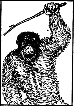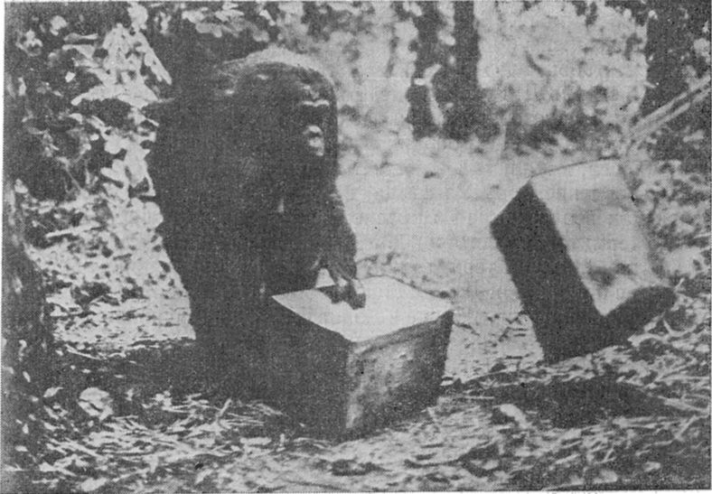 Ну а самым сенсационным оказалось то, что обезьяны могут не только использовать, но и изготовлять орудия. В Либерии Д. Битти видел, как живущие на воле дикие шимпанзе раскалывают орехи: «Он взял камень и принялся ударять им по ореху, предварительно положив его на другой плоский камень». Б. Мерфильд наблюдал, как несколько шимпанзе добывают мед из гнезда земляных пчел: «Каждая обезьяна держала длинную ветку, совала ее в пчелиный ход и вынимала покрытую медом. Ход был один, и хотя в большинстве случаев обезьяны совали в него ветви по очереди, то и дело вспыхивали ссоры, а те, которые слизали свой мед, старались отнять только что обмакнутые веточки» (Шаллер, 1968).