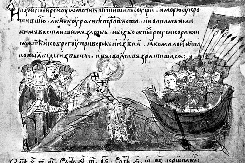 Патриарх Фотий и византийский император Михаил III касаются Ризой Богоматери поверхности моря. Радзивилловская летопись