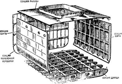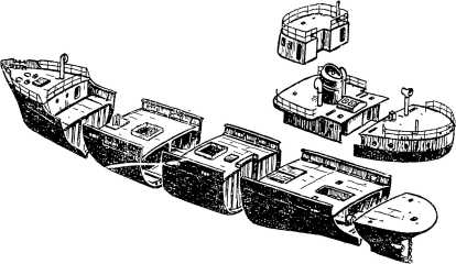 Примерно то же произошло и с постройкой парохода. Судостроители рассудили так: нельзя ли уподобить пароход дому? Как бы разбить днище, борта и палубы парохода на большие куски — секции? Как бы эти секции изготовлять заранее в цехе в удобных условиях, а потом быстро собирать из них на стапеле корпус парохода? Так и сделали. Затем секции стали объединять в более крупные куски парохода — блоки.