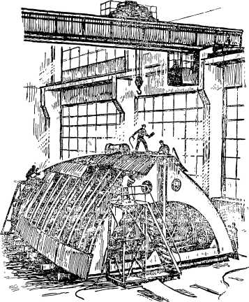 Еще двадцать лет назад техника постройки парохода была невысокой. Тогда корпус на стапеле собирали из многих тысяч отдельных деталей и узлов. Из множества ребер, подаваемых по очереди, составляли скелет корпуса. Потом на скелете собирали оболочку, опять-таки из отдельных листов наружной обшивки и палуб. Все части корпуса соединяли заклепками. Условия работы были трудными. Вес машинки для сверления дыр достигал 30 килограммов, а клепального пневматического молотка — 16 килограммов. Такой инструмент приходилось держать на весу, часто изгибаясь в три погибели в тесных отсеках. Барабанные перепонки рабочих лопались от страшного звенящего грохота, а легкие человека разъедались дымом от горнов для подогрева заклепок.