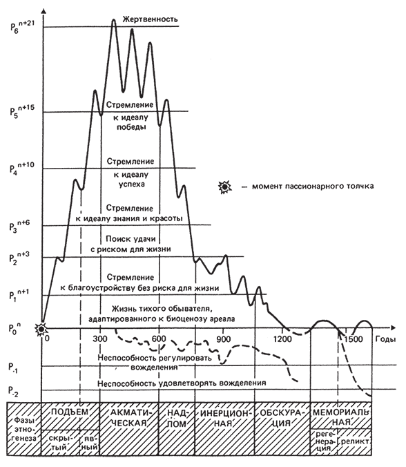 Предлагаемая кривая – обобщение 40 индивидуальных кривых этногенеза, построенных нами для различных этносов, возникших вследствие различных толчков. Пунктирной кривой отмечен качественный ход изменения плотности субпассионариев в этносе. Внизу указаны названия фаз этногенеза соответственно отрезкам по шкале времени: подъем, акматическая, надлом, инерционная, обскурация, регенерация, реликт.