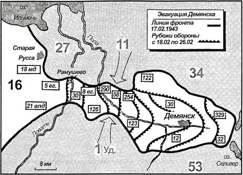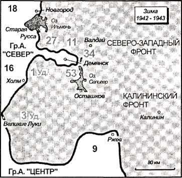 Примерно в двухстах пятидесяти километрах южнее Ленинграда, между озерами Ильмень и Селигер, в начале 1943 года немецкий фронт все еще глубоко вклинивался в форме гриба в советскую территорию. Это был фронт немецкого 2-го армейского корпуса вокруг Демянска. В «грибе» находилось двенадцать дивизий, примерно 100 000 человек. Ширина ножки «гриба» составляла лишь десять километров.
