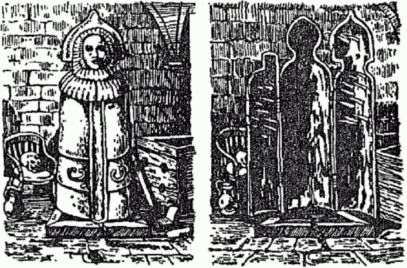 Эти два гвоздя выкалывали глаза. Когда дверцы раскрывались, жертва с помощью тайного механизма втягивалась во внутренность этой страшной статуя, и дверцы затворялись. Там несчастного пронзали ножи и гвозди, и через полминуты пол, состоявший из опускной двери, раскрывался и несчастный проваливался вниз. Но там его ожидали мучения еще страшнее: под опускной дверью находились шесть больших деревянных валов, расположенных парами, один над другим. Таких пар было три. Валы были снабжены острыми клинками. Расстояние между верхней парой параллельных валов было такое, что человеческое тело лежало между ними. Средняя пара была ближе, нижняя совсем близко. Под этим страшным аппаратом было отверстие, в котором слышался плеск воды. Механизм, отворявший двери статуи, также приводил в движение валы. Жертва, уже страшно изувеченная и с выколотыми глазами, падала в опускную дверь между верхней парой валов, и тело ее разрезалось со всех сторон ножами, которыми были утыканы валы. В этом обезображенном состоянии трепещущаяся масса падала между второй и ближе сдвинутой парой валов и, вся изрубленная, попадала на самую нижнюю пару, которая превращала ее в маленькие куски, падавшие в ручей, протекавший внизу и уносивший ее.