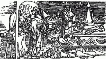 На рис. 25 можно увидеть чеканку монет во Франции в период царствования Людовика XII (1462–1515). Один мастер обрезает ножницами кружочки, другой изготовляет листы серебра, третий чеканит. За большим столом казначей ведет учет выпускаемой монеты. Огромная печать, ножницы, молотки и штемпели — вот вся примитивная техника средневекового монетного двора.